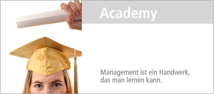 Die Academy stützt sich auf die international bewährte didaktische Methode, theoretische Konzepte ("knowledge") in Verbindung mit Fallstudien ("cases") und praktischen Übungen sowie Praxisprojekten ("action") zu vermitteln. Der Umgang mit komplexen Problem- situationen wird geübt und der Transfer des Wissens in die Praxis fällt leichter.